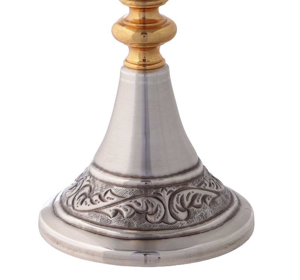 Chén thánh Italy xi vàng CLXV2148 hai màu vàng – bạc với bề mặt chạm khắc tinh xảo và họa tiết hoa trang nhã. Sản phẩm được chế tác từ đồng, hoàn thiện bằng kỹ thuật chạm bạc tinh tế, nổi bật với phần nút thân được mạ vàng 24K tạo điểm nhấn sang trọng. Phần lòng chén được mạ vàng bóng, vừa tăng tính thẩm mỹ vừa phù hợp với yêu cầu phụng vụ.