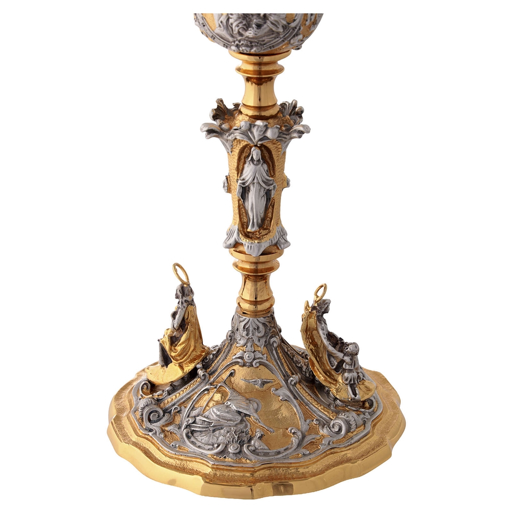 Phần chén được tiếp nối bằng những huy chương chạm khắc hình Đức Mẹ bồng Chúa Hài Đồng và Thánh Phêrô, vị Tông đồ trưởng và nền tảng của Hội Thánh. Những chi tiết này góp phần nhấn mạnh sự hiệp thông giữa Hội Thánh trần thế với mầu nhiệm cứu độ được hiện tại hóa trong Thánh lễ.