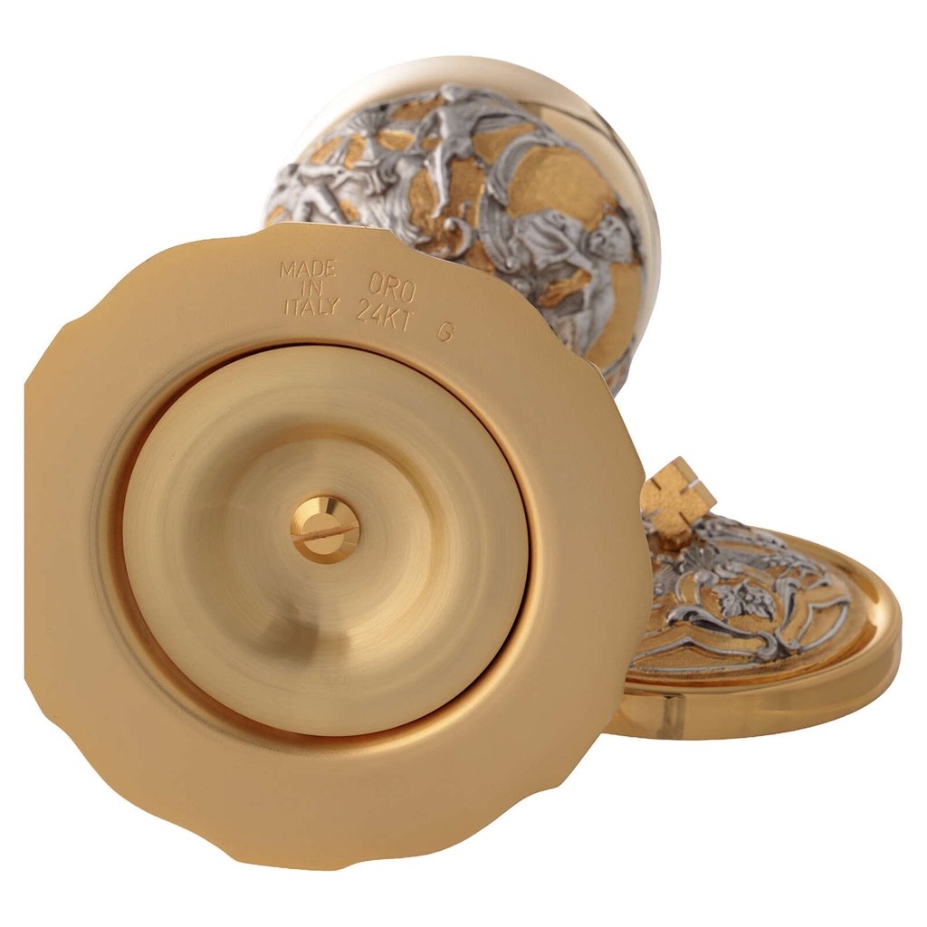 Ngoài ra, phần đế còn được trang trí bằng các tượng phù điêu nhỏ diễn tả hình ảnh Thánh Tâm Chúa Giêsu và Thiên Thần Hộ Thủ, như lời nhắc nhớ về tình yêu cứu độ vô biên của Chúa Kitô và sự đồng hành thiêng liêng của các thiên thần trong đời sống đức tin. Từng chi tiết trên chén lễ đều được hoàn thiện với sự chăm chút tỉ mỉ, thể hiện trình độ thủ công điêu luyện của các nghệ nhân Ý và truyền thống kim hoàn thánh lâu đời.