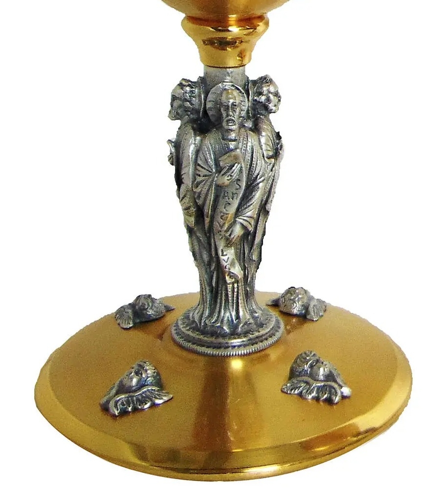 Điểm nhấn đặc biệt của chén lễ nằm ở phần trang trí đầy tính nghệ thuật: phần đế được tô điểm bằng bốn khuôn mặt thiên thần được tạo tác tinh tế, như biểu tượng của sự tôn kính và ca tụng mầu nhiệm thánh. Nổi bật hơn cả là phần nút chén (knop), nơi được gắn các tượng nhỏ chạm khắc công phu tượng trưng cho Bốn Thánh Sử: Thánh sử Mátthêu, Thánh sử Máccô, Thánh sử Luca và Thánh sử Gioan. Những hình tượng này không chỉ làm phong phú giá trị thẩm mỹ mà còn nhấn mạnh nền tảng Tin Mừng, nhắc nhớ rằng chính lời chứng của các Thánh Sử là cội nguồn đức tin và là nền tảng cho đời sống phụng vụ của Giáo Hội.