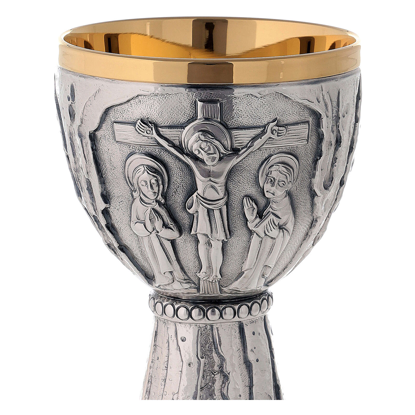 Trên mặt ngoài của chén thánh và bình thánh, các họa tiết thô và điêu khắc được tạo ra với hiệu ứng tinh xảo, khắc họa khoảnh khắc Chúa Giêsu bị chịu khổ nạn một cách tinh tế và sâu sắc. Bên trong, cả lòng cốc đều được mạ vàng 24K.
