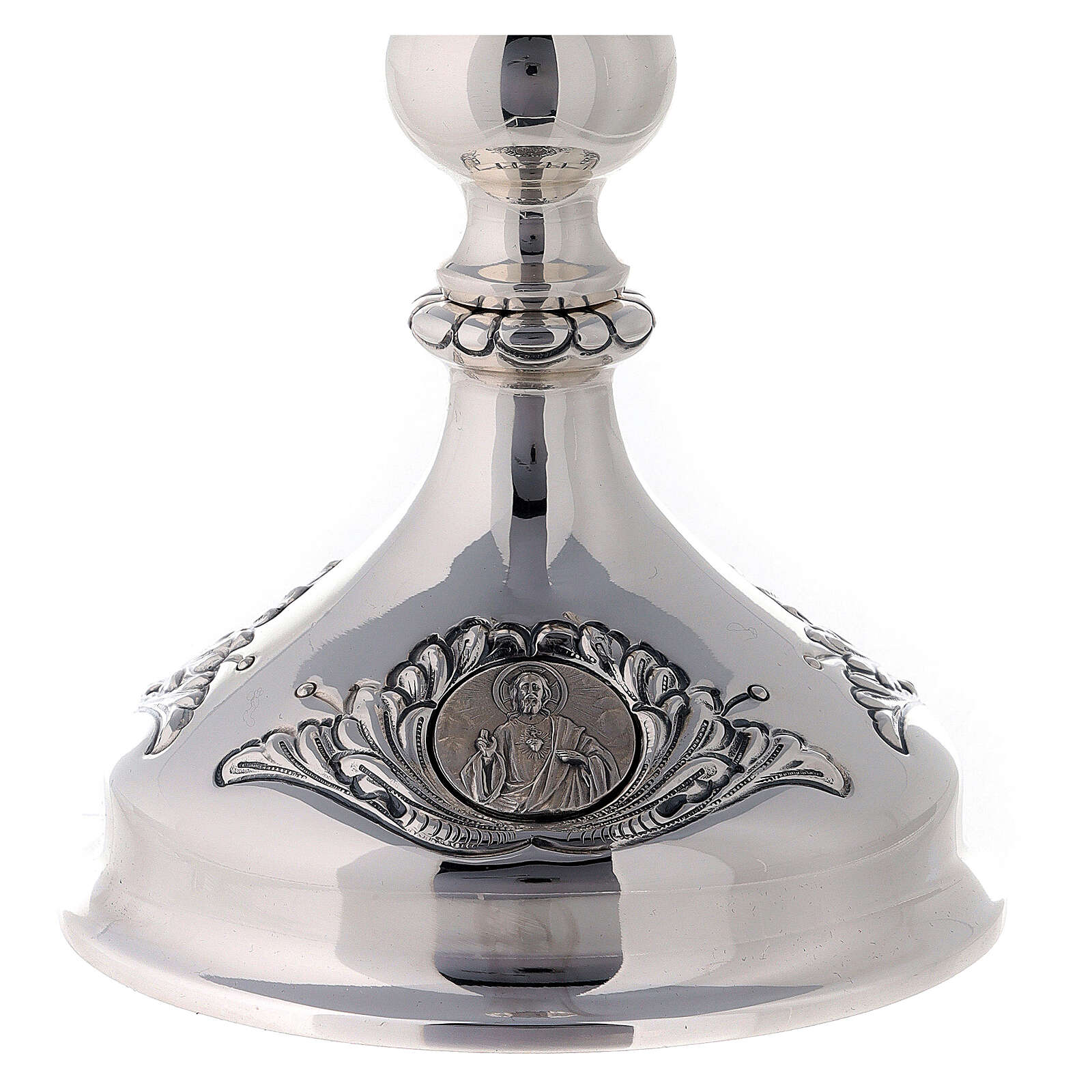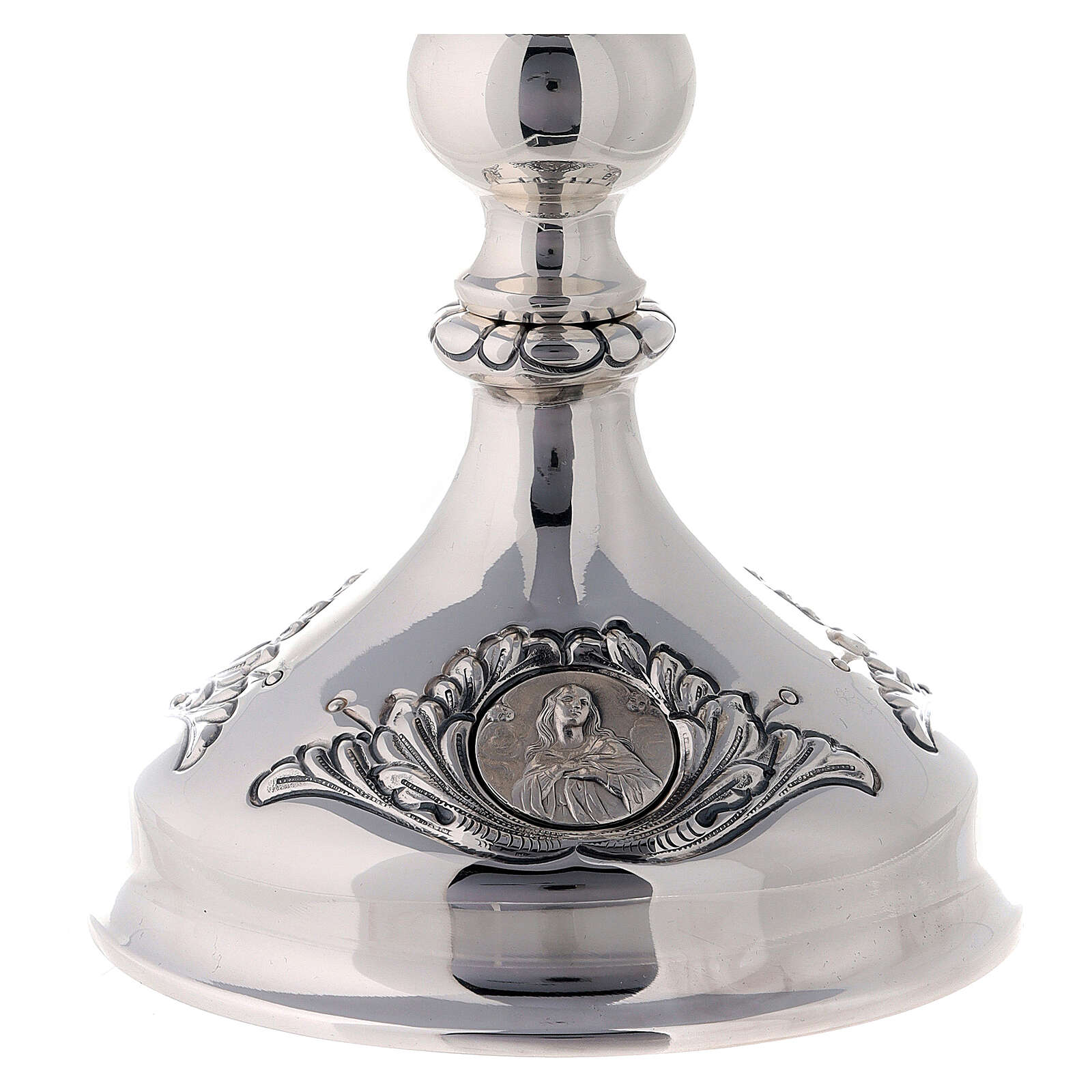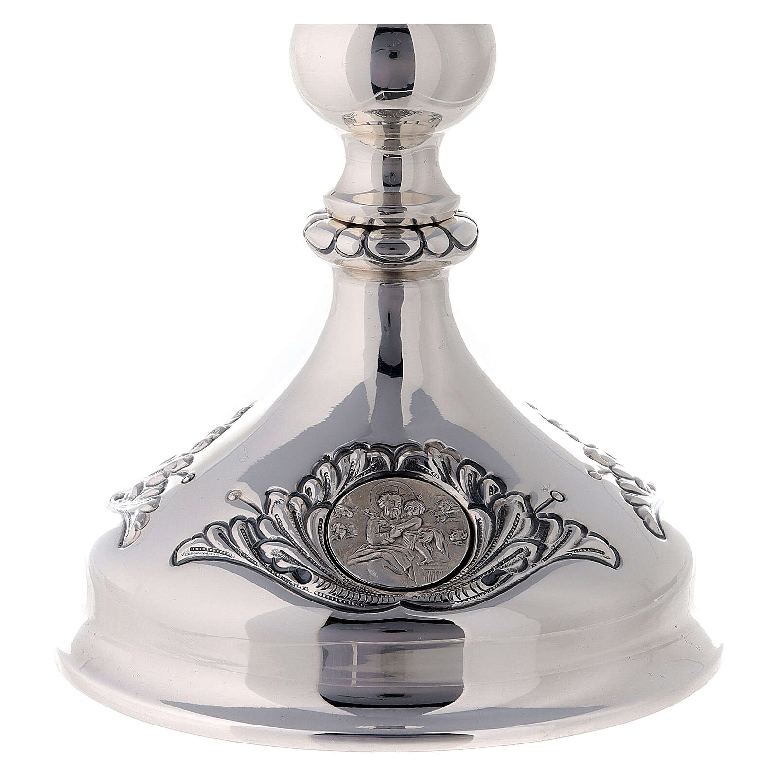 Điểm nhấn của sản phẩm tại phần chân đế là ba khung hình tròn mô tả hình ảnh Đức Trinh Nữ Maria, Thánh Giuse bế Chúa Hài Đồng và Thánh Tâm Chúa Giêsu, được mô tả trong bức phù điêu với sự tỉ mỉ đến từng chi tiết nhỏ. Sự kết hợp giữa các yếu tố trang nhã và trang trọng của phần đế với những hoa văn thanh mảnh, nét đục khắc không mạnh bạo, quá sâu cũng không quá nông, cảm giác nhẹ nhàng tạo nên một tác phẩm nghệ thuật thánh thiện và đáng kính.