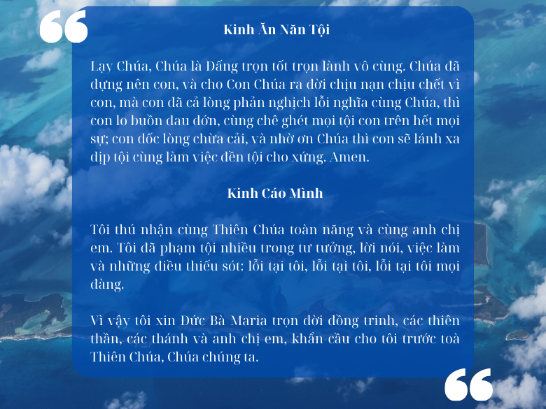Tôi thú nhận cùng Thiên Chúa toàn năng và cùng anh chị em. Tôi đã phạm tội nhiều trong tư tưởng, lời nói, việc làm và những điều thiếu sót: lỗi tại tôi, lỗi tại tôi, lỗi tại tôi mọi đàng.