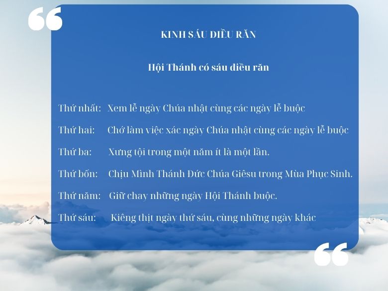 Bên cạnh những bí tích linh thiêng và lễ nghi trang trọng, 'Kinh sáu điều răn' đóng vai trò quan trọng trong việc hướng dẫn và điều chỉnh đời sống đạo đức của người theo đạo công giáo. Những lời mệnh lệnh sáng tạo này không chỉ là hướng dẫn đối với hành vi bên ngoài mà còn là nguồn cảm hứng và động viên cho mỗi tín đồ trong hành trình tìm kiếm sự thánh thiện và lòng trung thành với Chúa. Hãy cùng nhau khám phá và suy ngẫm về ý nghĩa sâu xa của những điều răn này, và cố gắng thực hiện chúng trong cuộc sống hàng ngày để được gần gũi với Thiên Chúa hơn