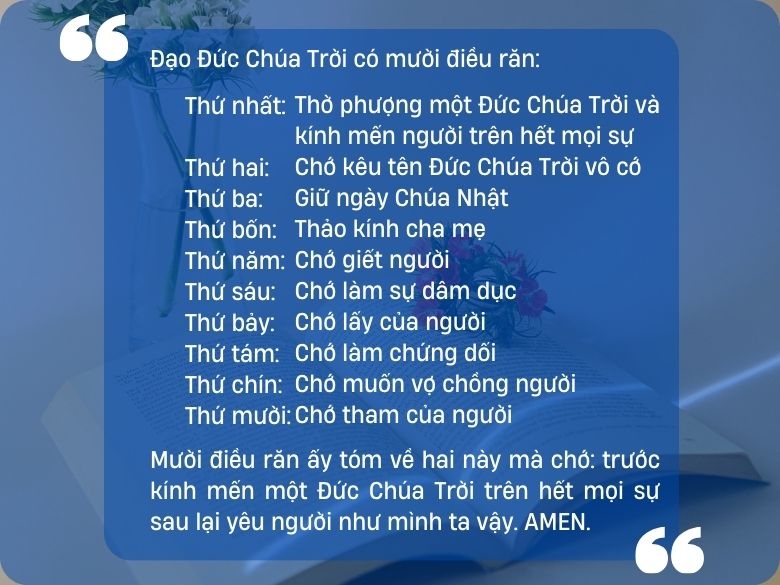 Xin chúc chúng ta mỗi sớm mai thức giấc dẫu là sóng gió hay hạnh phúc chúng ta đều sống chính trực và được bình an mọi sự, vậy xin hãy nhẩm thuộc kinh Mười điều răn của Đức Chúa Trời này.